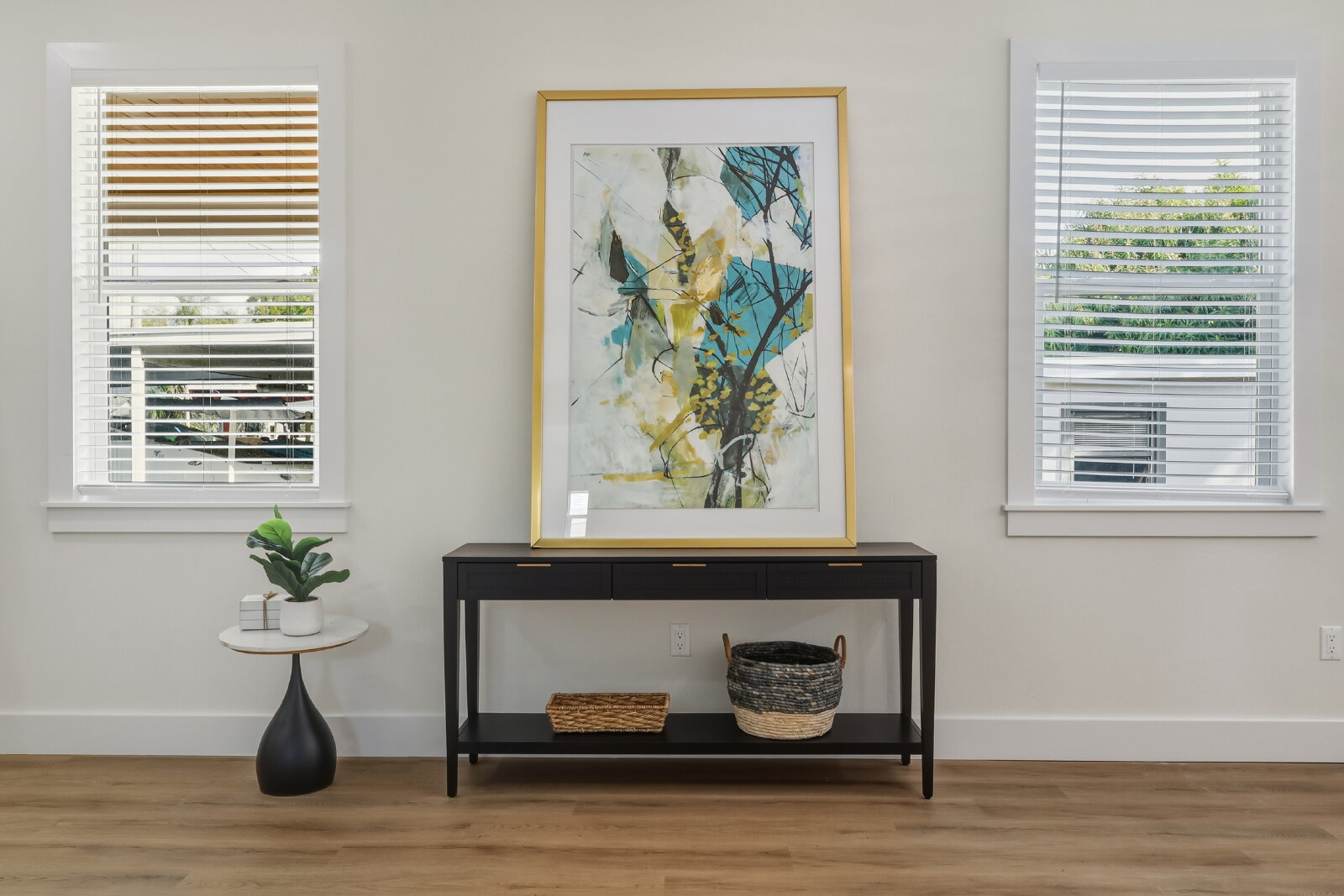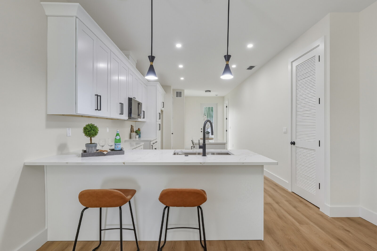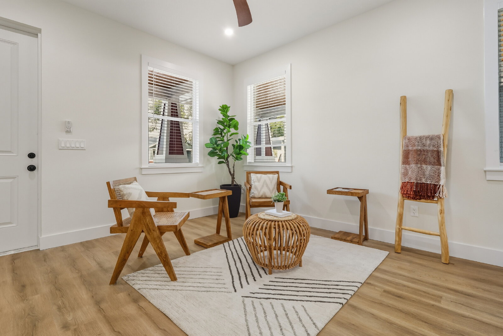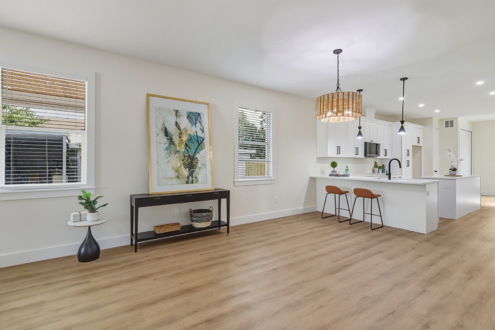Inside, you’ll find a bright, open floor plan with abundant natural light and luxury vinyl plank flooring throughout—combining style and durability. Thoughtful design elements, including custom accent walls and warm wood trim details, add a unique touch and elevate the overall feel of the home.